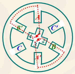 ![]() A 相通電使轉(zhuǎn)子1、3齒和 AA' 對齊。